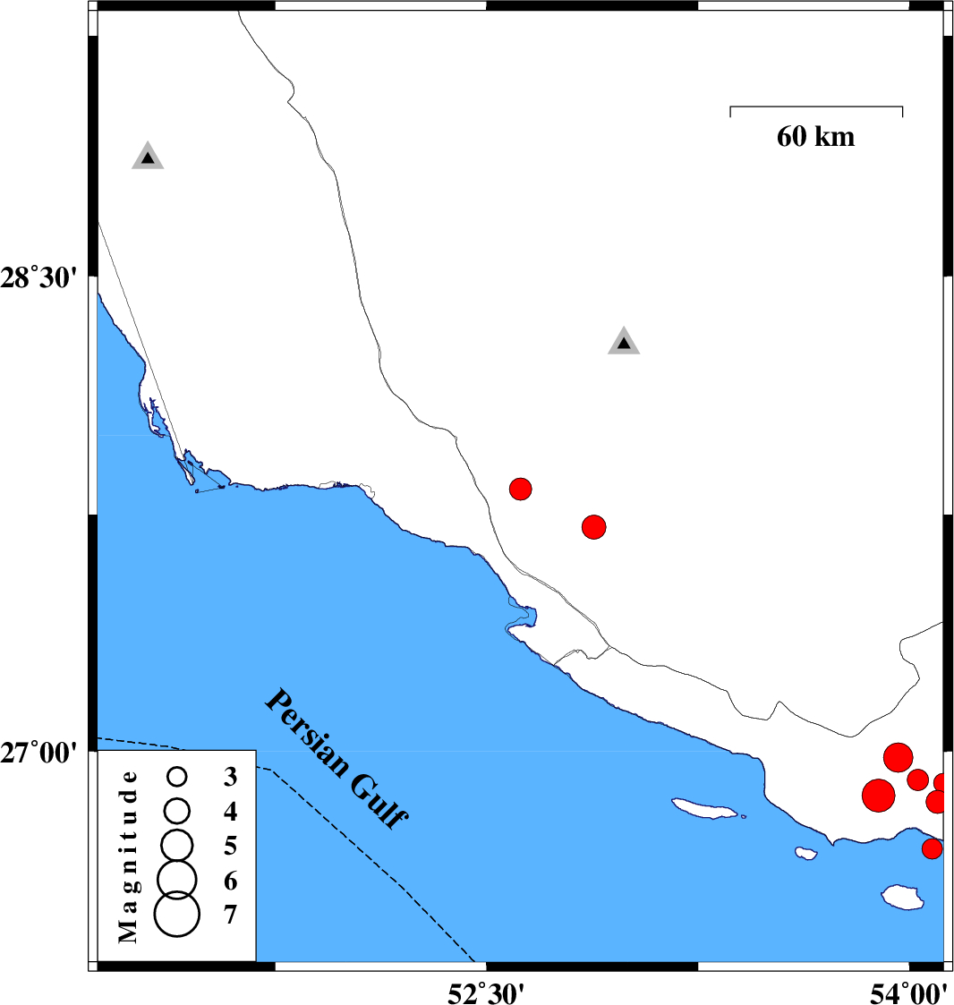 | 2012/09/06 | 03:43:43.4 | 08:13:43.4 | 26.98 | 53.96 | 46 | ML:4.7 | Hormozgan Province, 47 km South-West of Bastak | ||