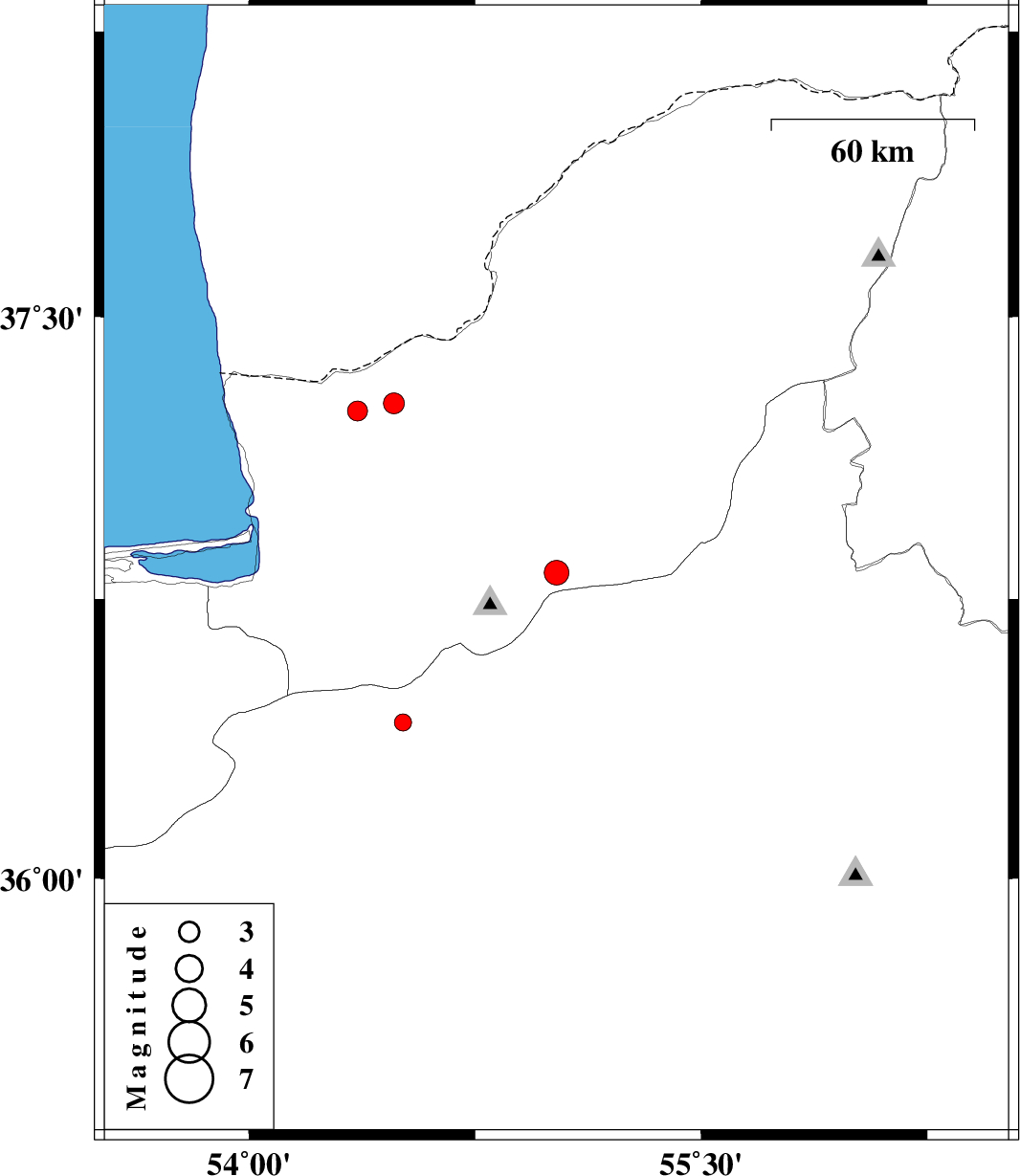 | 2012/09/04 | 00:18:59.4 | 04:48:59.4 | 37.27 | 54.48 | 26 | ML:3.1 | Golestan Province, 29 km North of Aq Qaleh | ||