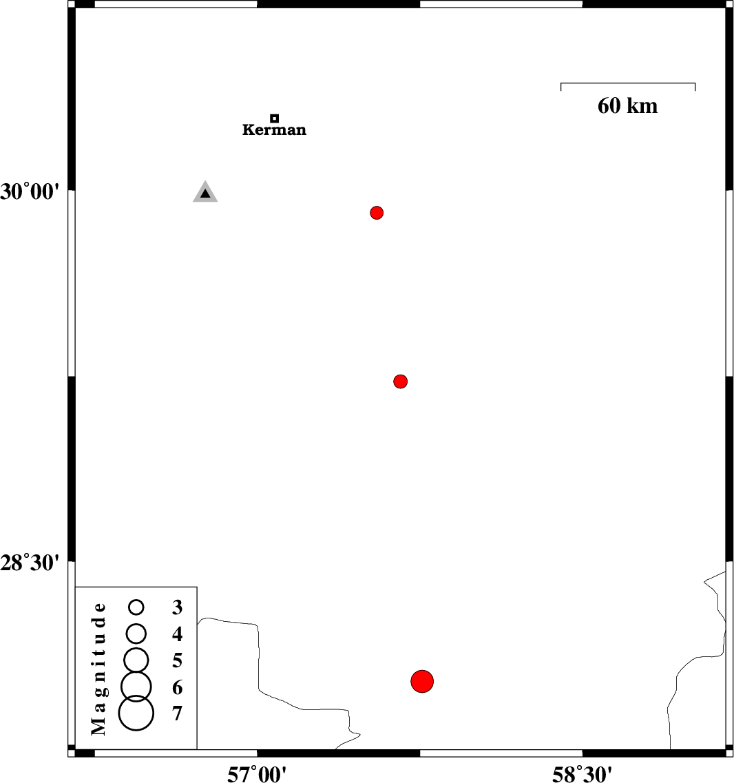 | 2012/09/03 | 20:01:52.0 | 00:31:52.0 | 29.91 | 57.55 | 14 | ML:2.7 | Kerman Province, 62 km South-East of Kerman | ||