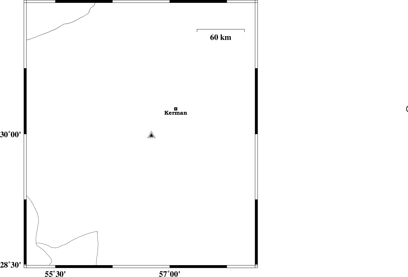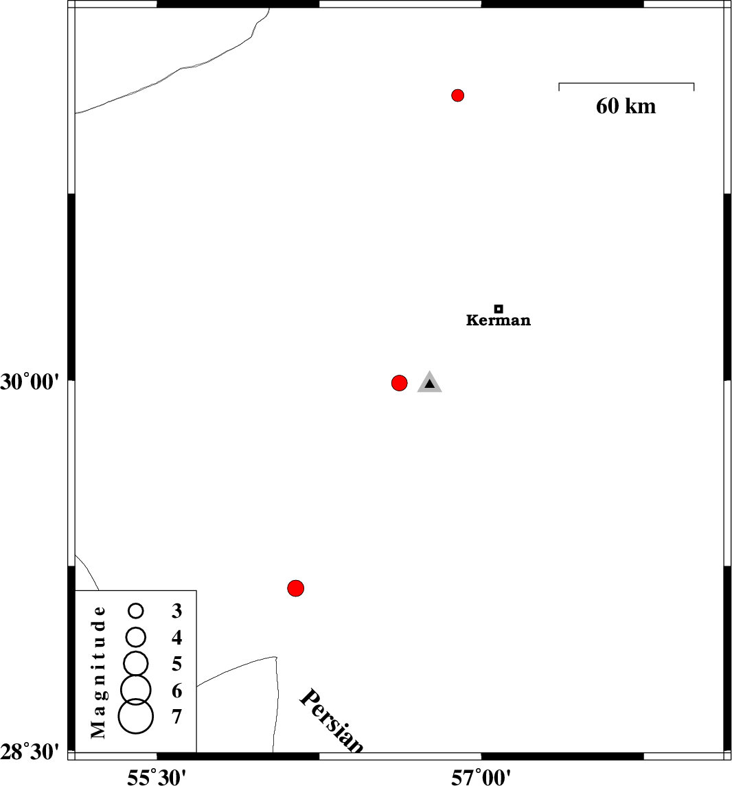 | 2012/09/16 | 15:26:34.9 | 19:56:34.9 | 29.99 | 56.62 | 14 | ML:3.2 | Kerman Province, 9 km Bardsir | ||