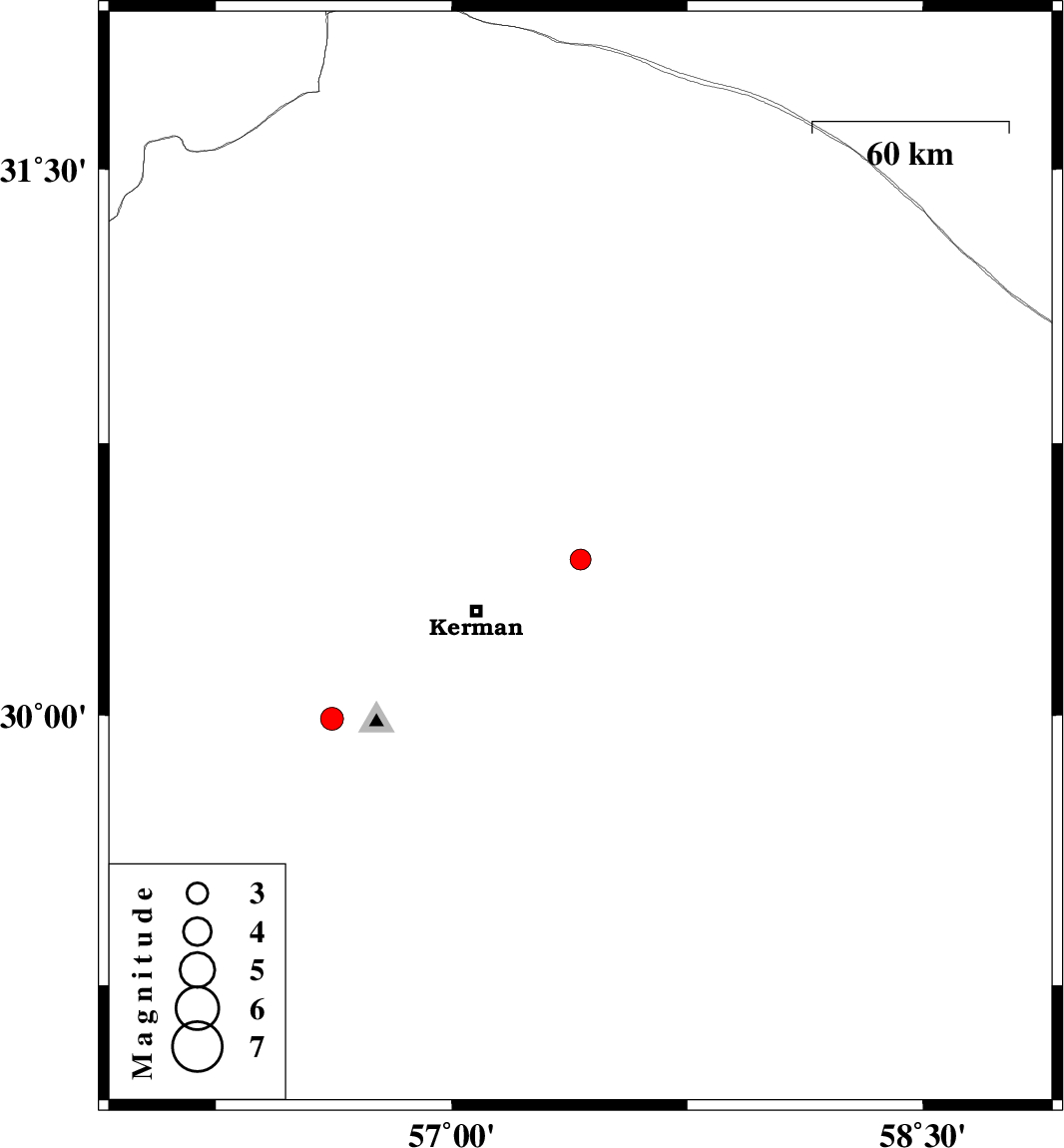 | 2012/09/18 | 13:22:54.5 | 17:52:54.5 | 30.43 | 57.41 | 14 | ML:2.9 | Kerman Province, 35 km North-East of Kerman | ||