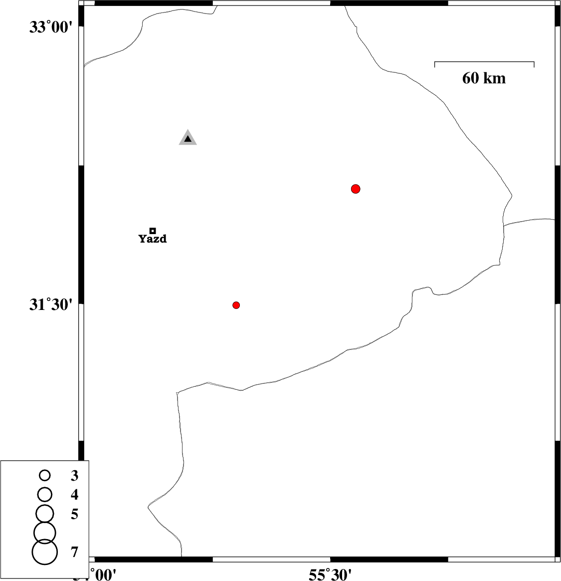 | 2012/09/21 | 11:51:09.4 | 15:21:09.4 | 31.61 | 55.43 | 22 | ML:2 | Yazd Province, 3 km Bafq | ||