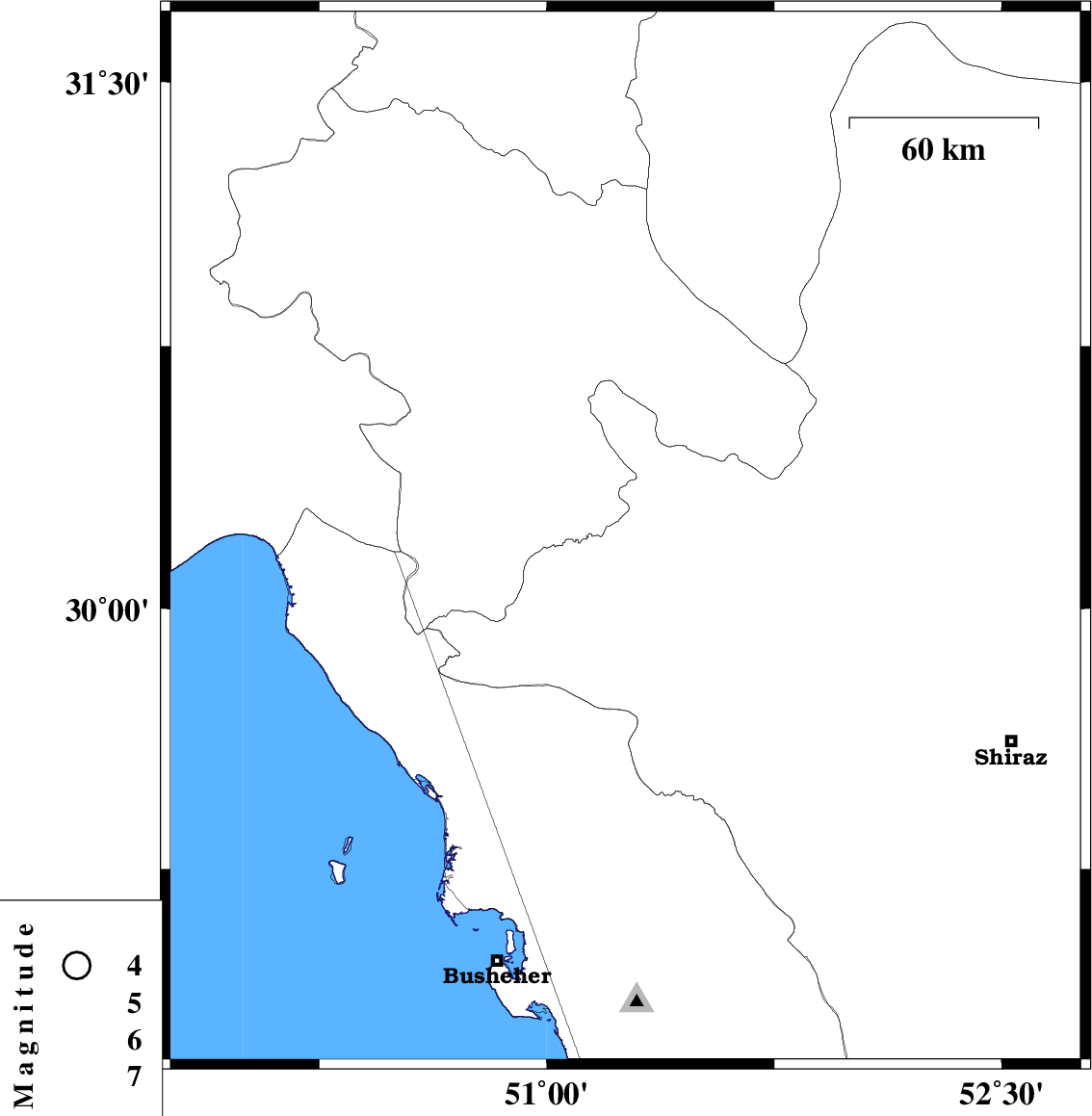 | 2012/09/26 | 22:58:34.8 | 02:28:34.8 | 30.2 | 51.26 | 46 | ML:3 | Fars Province, 27 km West of Nurabad | ||