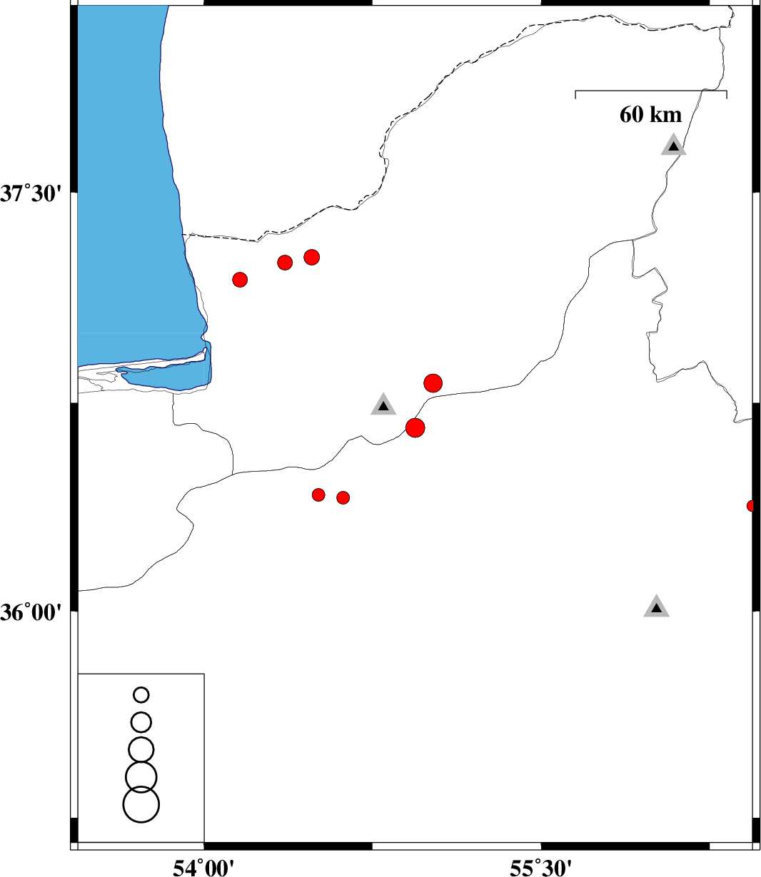 | 2012/09/04 | 00:18:59.4 | 04:48:59.4 | 37.27 | 54.48 | 26 | ML:3.1 | Golestan Province, 29 km North of Aq Qaleh | ||
