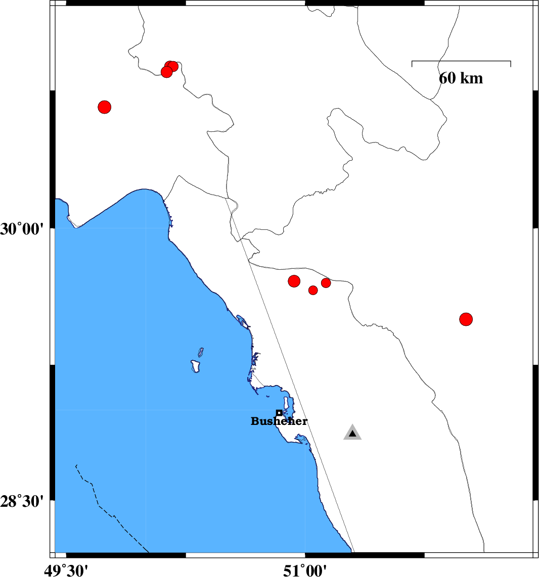 | 2012/10/15 | 18:44:36.3 | 22:14:36.3 | 29.71 | 50.93 | 27 | ML:3.4 | Bushehr Province, 43 km North-East of Bandar-e genaveh | ||
