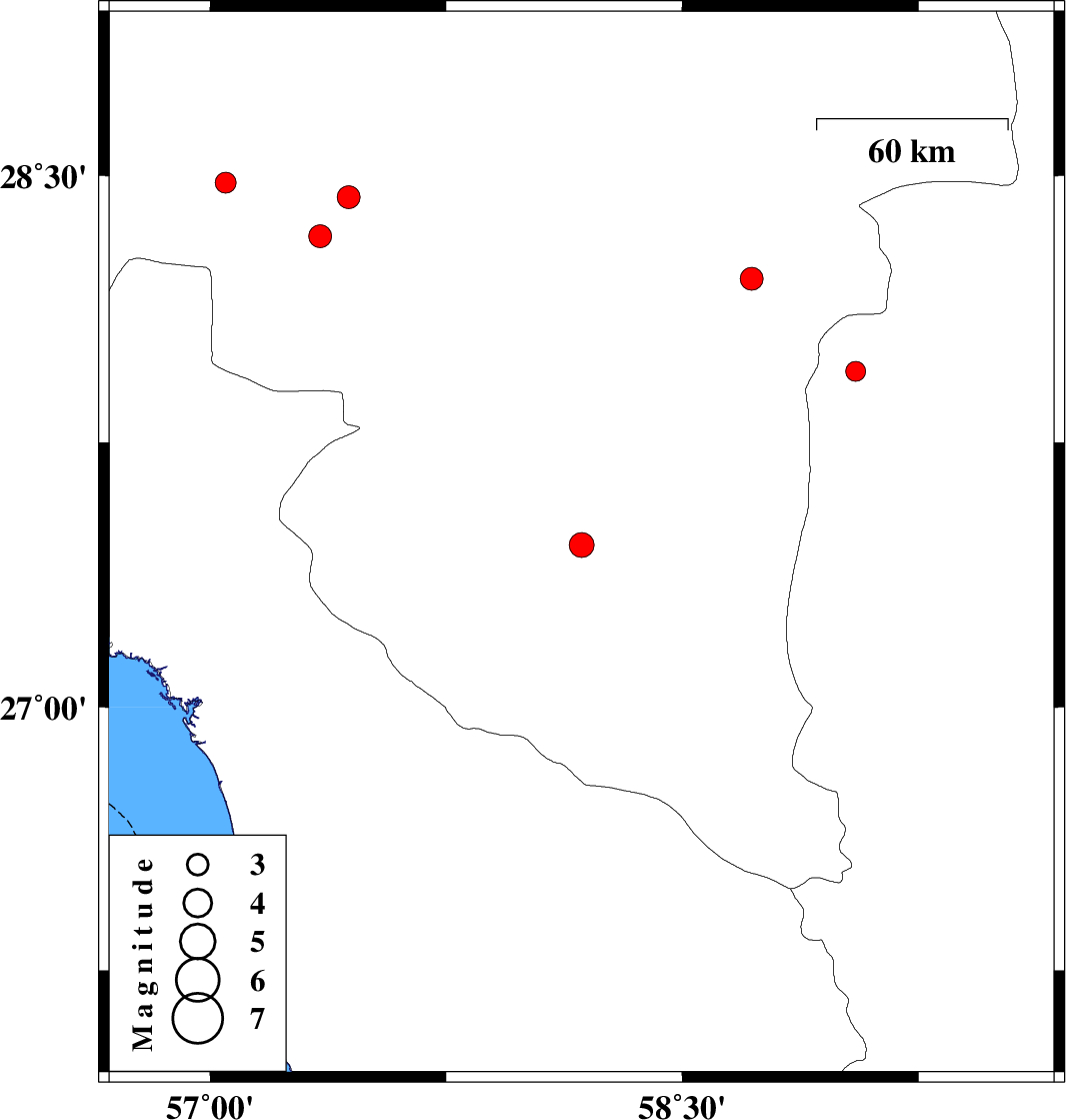 | 2012/09/19 | 02:19:38.5 | 06:49:38.5 | 28.33 | 57.35 | 14 | ML:3.2 | Kerman Province, 54 km North-West of Kahnuj |