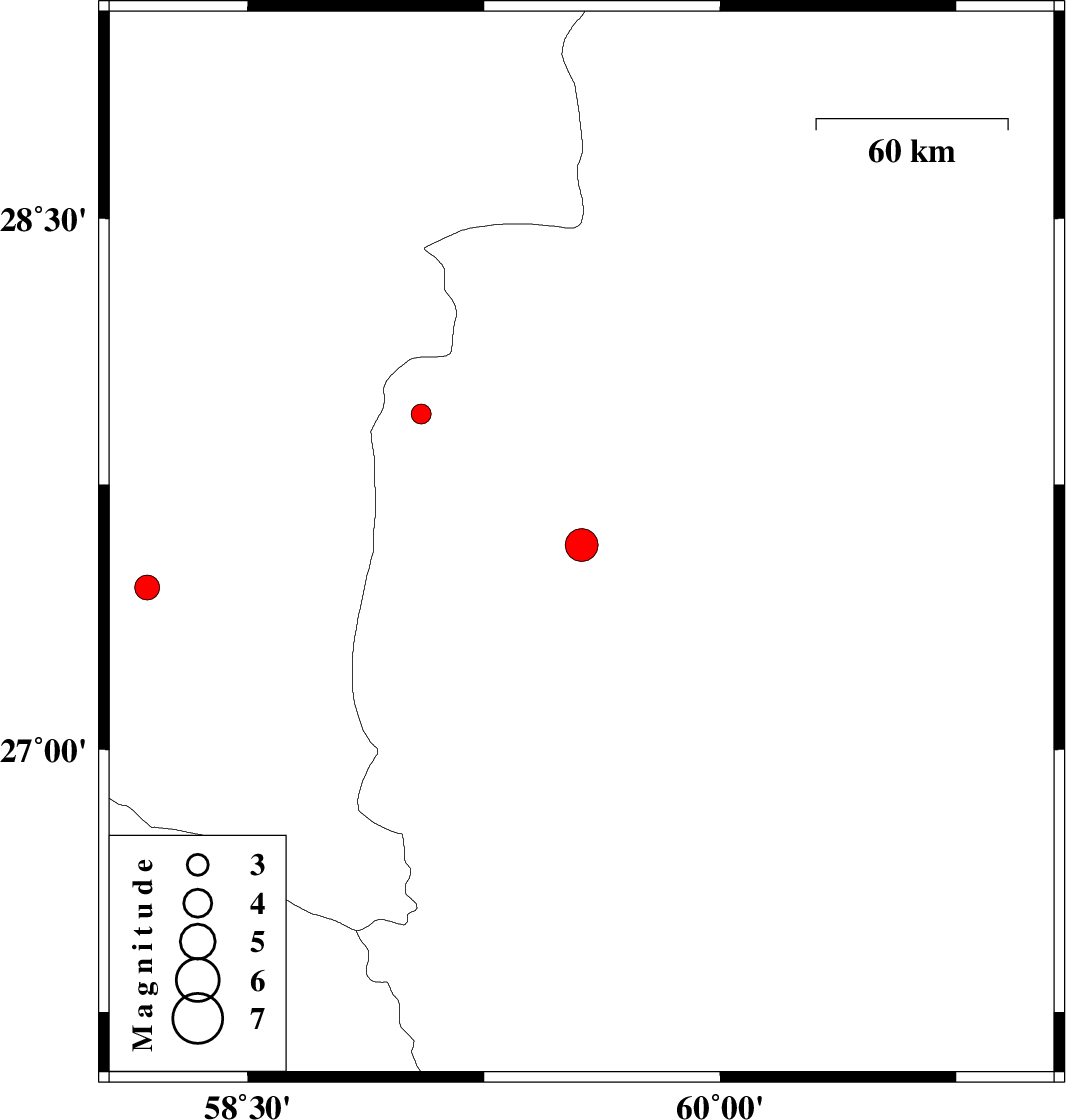 | 2012/10/07 | 20:20:09.6 | 23:50:09.6 | 27.95 | 59.05 | 14 | ML:2.8 | Sistan va Baloochestan Province, 133 km East of Kahnuj |