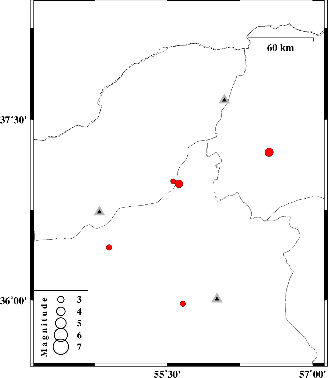 | 2012/10/16 | 00:15:36.2 | 03:45:36.2 | 35.97 | 55.66 | 6 | ML:2.6 | Semnan Province, 79 km South-East of Shahrud |