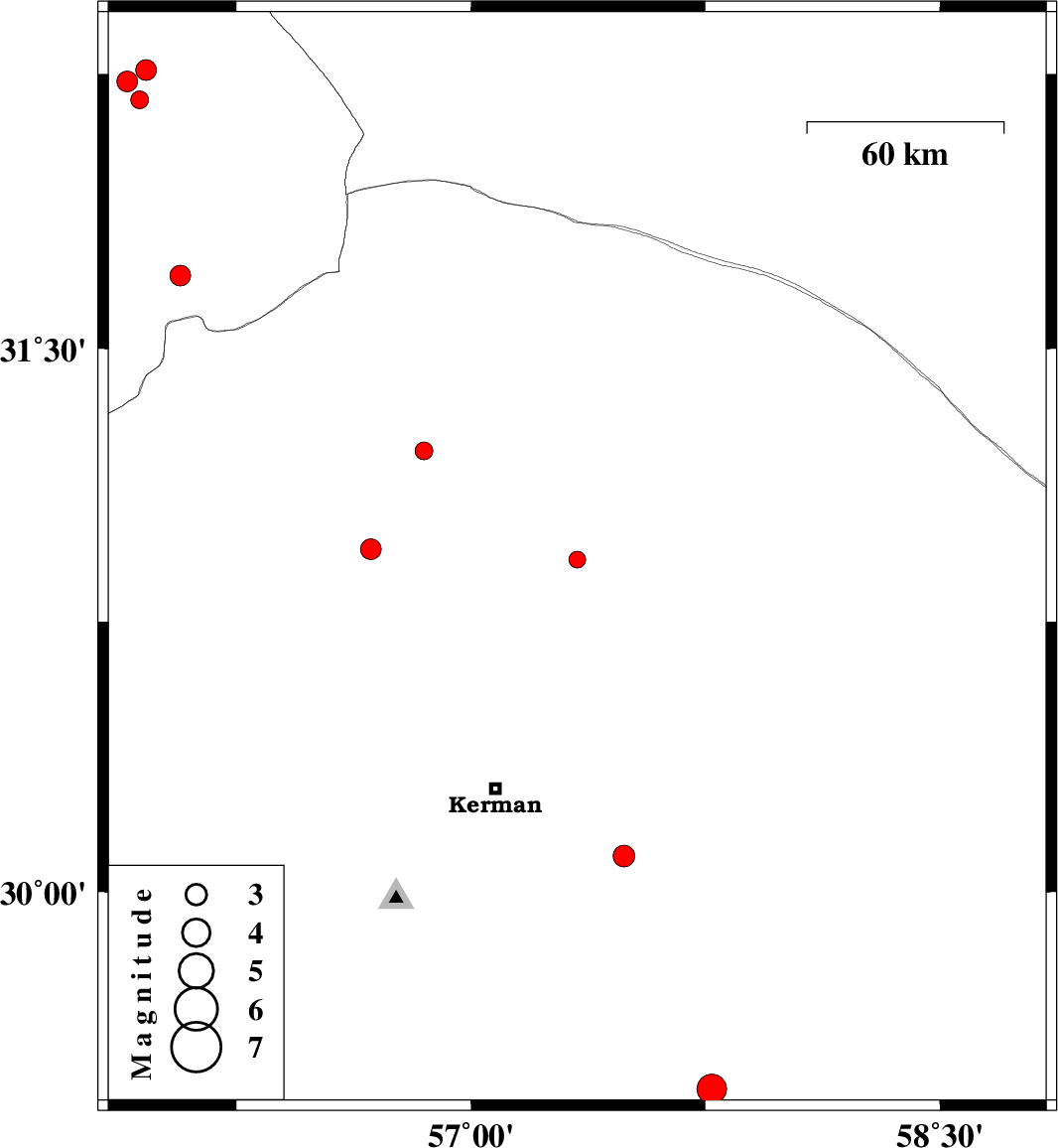 | 2012/10/05 | 03:16:23.1 | 06:46:23.1 | 30.95 | 56.68 | 15 | ML:3 | Kerman Province, 19 km North-East of Zarand |