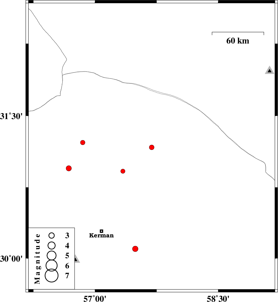 | 2012/10/06 | 00:16:14.9 | 03:46:14.9 | 30.1 | 57.49 | 15 | ML:3.1 | Kerman Province, 45 km South-East of Kerman | ||