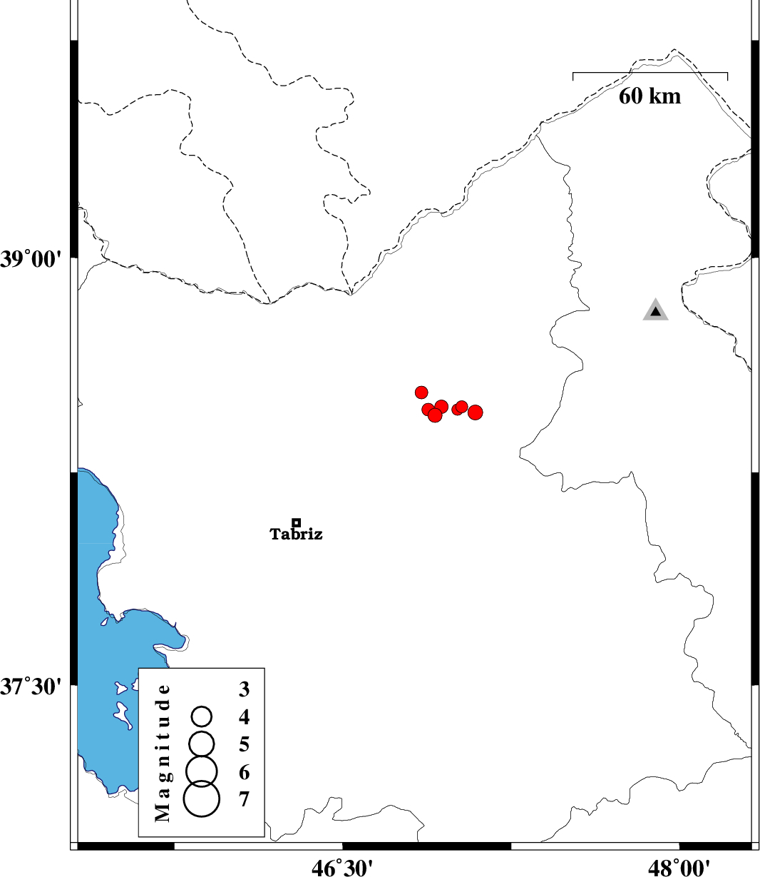 | 2012/10/30 | 08:03:08.3 | 11:33:08.3 | 38.45 | 46.61 | 14 | ML:2.2 | Azarbaijan Sharghi Province, 41 km West of Ahar |