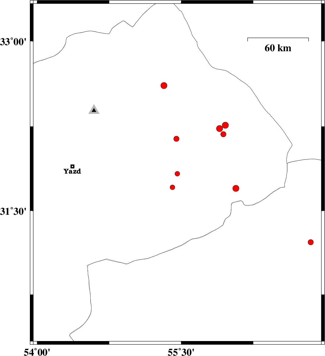 | 2012/11/08 | 12:53:29.6 | 16:23:29.6 | 31.83 | 55.46 | 15 | ML:2.2 | Yazd Province, 25 km North of Bafq | ||