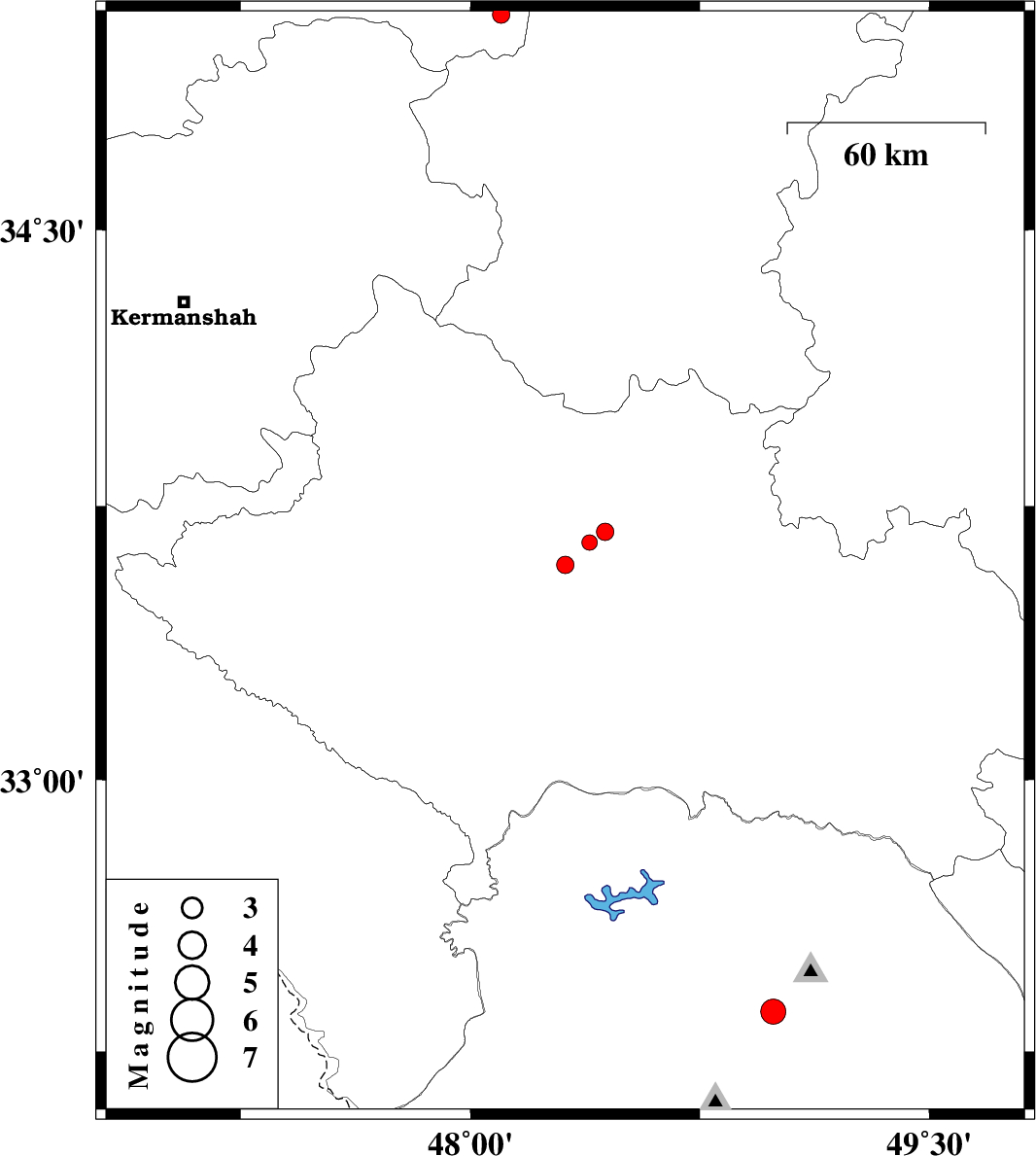 | 2012/11/10 | 16:17:30.0 | 19:47:30.0 | 33.59 | 48.31 | 18 | ML:2.5 | Lorestan Province, 12 km North of Khorramabad | ||