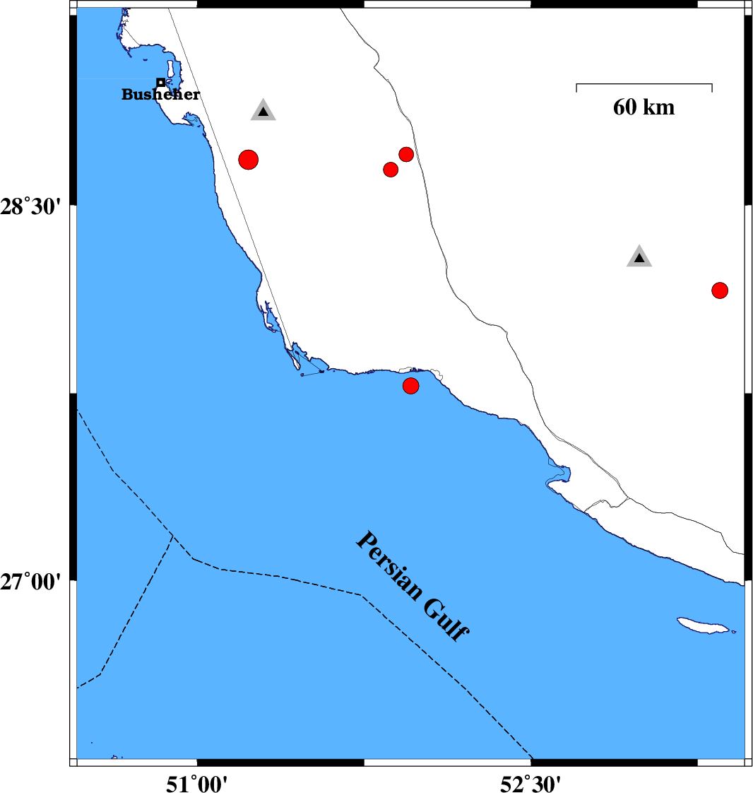 | 2012/11/16 | 04:57:48.3 | 08:27:48.3 | 27.78 | 51.96 | 15 | ML:3.2 | Persian Gulf, 12 km West of Bandar-e kangan | ||