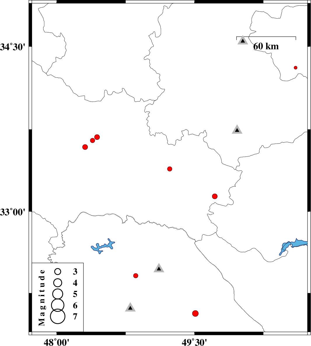 | 2012/11/16 | 18:21:56.7 | 21:51:56.7 | 33.39 | 49.23 | 14 | ML:2.2 | Lorestan Province, 18 km East of Dorud | ||