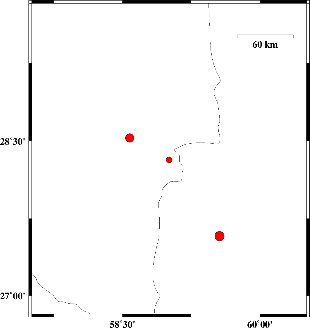 | 2012/11/17 | 08:46:01.1 | 12:16:01.1 | 28.32 | 59.01 | 46 | ML:3 | Kerman Province, 109 km South-East of Bam | ||