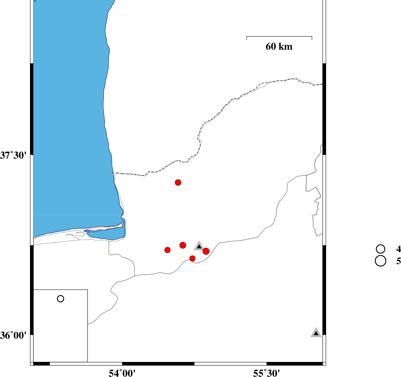 | 2012/11/12 | 08:35:05.9 | 12:05:05.9 | 36.75 | 54.63 | 14 | ML:2.9 | Golestan Province, 20 km East of Gorgan | ||