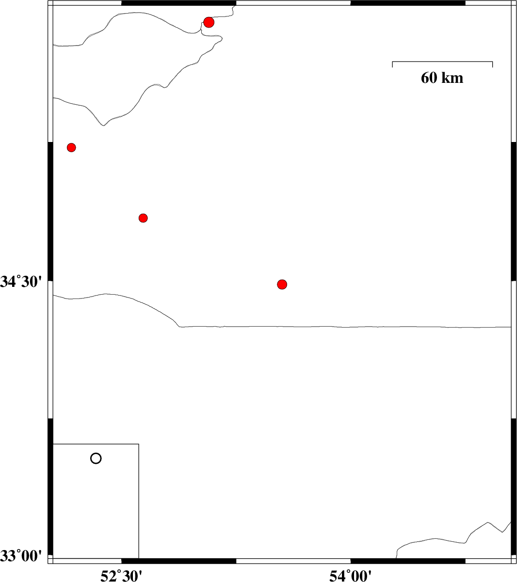 | 2012/11/18 | 16:08:20.9 | 19:38:20.9 | 34.48 | 53.55 | 18 | ML:2.8 | Semnan Province, 121 km South-East of Semnan | ||