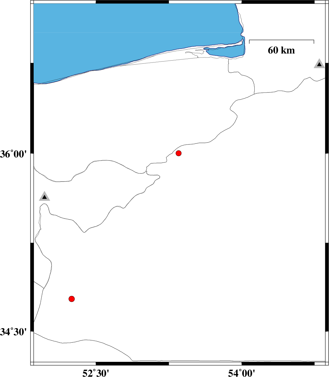 | 2012/11/22 | 17:47:37.1 | 21:17:37.1 | 34.74 | 53.08 | 14 | ML:3.2 | Semnan Province, 97 km South-West of Semnan |