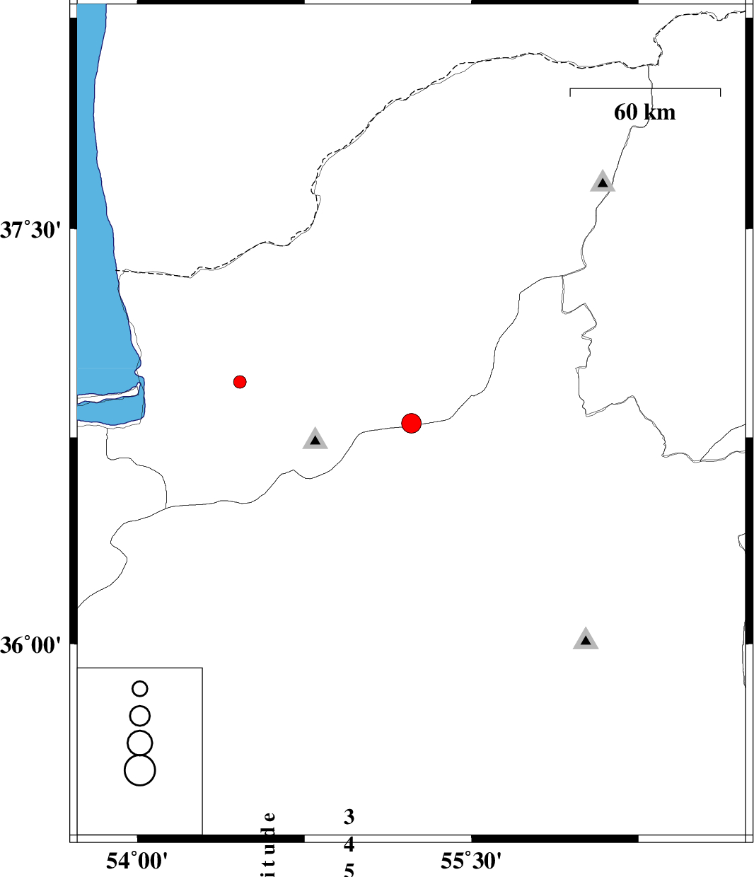 | 2012/12/01 | 08:38:25.2 | 12:08:25.2 | 36.8 | 55.23 | 14 | ML:3.9 | Golestan Province, 25 km South of Ramian | ||