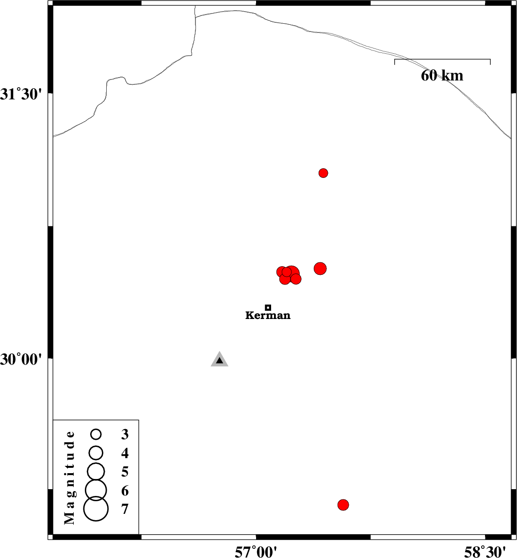 | 2012/11/14 | 00:46:13.4 | 04:16:13.4 | 30.51 | 57.42 | 16 | ML:3.6 | Kerman Province, 40 km North-East of Kerman | ||