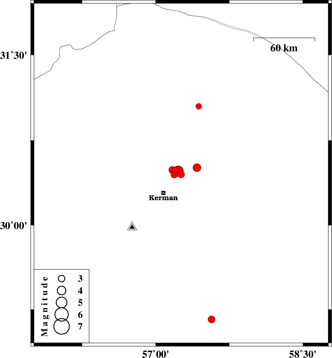 | 2012/11/14 | 00:46:13.4 | 04:16:13.4 | 30.51 | 57.42 | 16 | ML:3.6 | Kerman Province, 40 km North-East of Kerman | ||