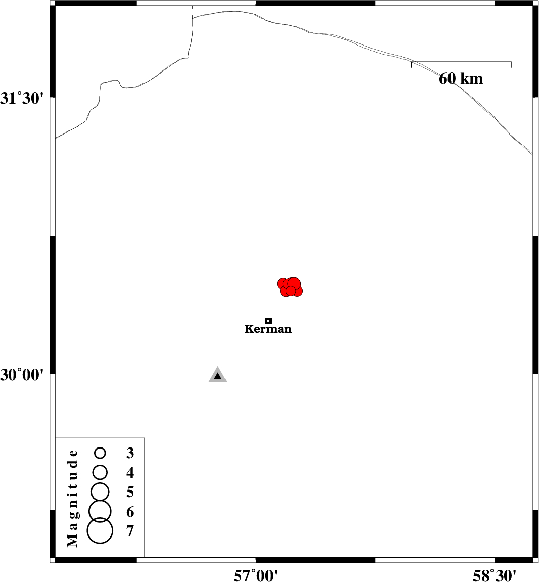 | 2012/12/03 | 20:12:30.0 | 23:42:30.0 | 30.45 | 57.26 | 14 | ML:3.1 | Kerman Province, 25 km North-East of Kerman | ||
