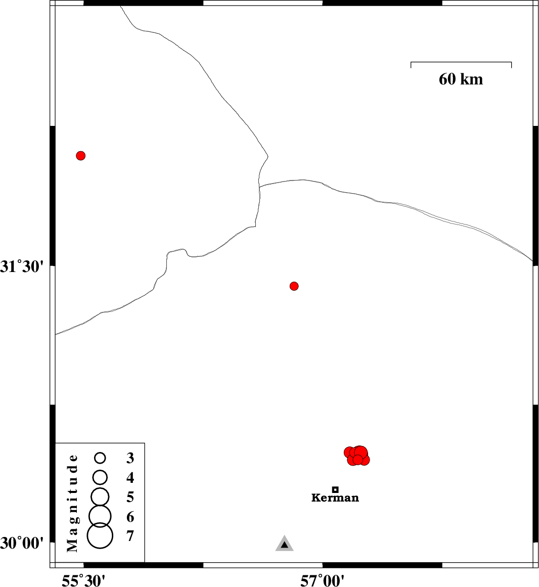 | 2012/12/04 | 01:18:33.0 | 04:48:33.0 | 30.45 | 57.22 | 14 | ML:2.8 | Kerman Province, 23 km North-East of Kerman | ||
