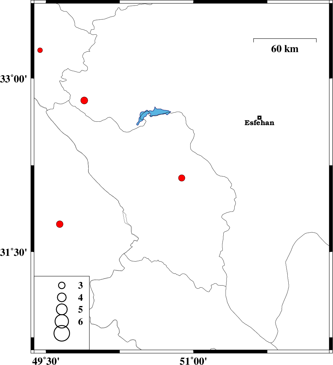 | 2012/12/03 | 15:02:10.6 | 18:32:10.6 | 32.81 | 49.89 | 14 | ML:3.2 | Esfahan Province, 25 km South-West of Fereydunshahr |