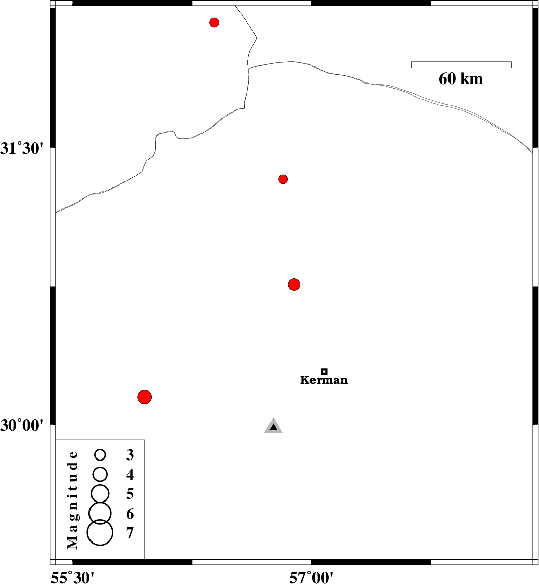 | 2012/12/19 | 11:44:17.7 | 15:14:17.7 | 30.76 | 56.89 | 18 | ML:3.4 | Kerman Province, 31 km East of Zarand | ||