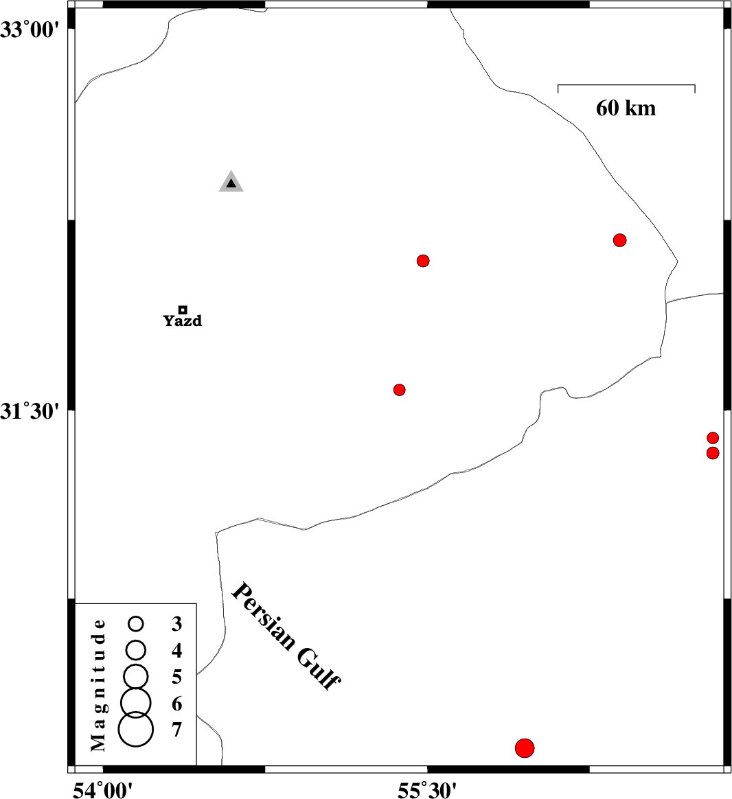| 2012/11/29 | 13:26:36.2 | 16:56:36.2 | 32.09 | 55.48 | 14 | ML:2.5 | Yazd Province, 55 km North of Bafq |