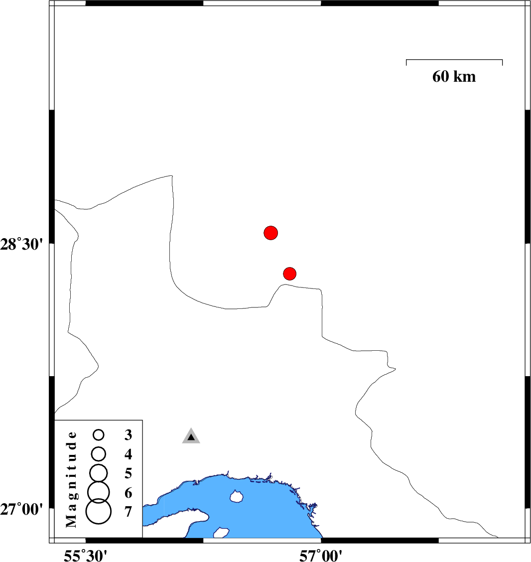 | 2012/12/22 | 20:23:31.7 | 23:53:31.7 | 28.33 | 56.8 | 18 | ML:3.6 | Kerman Province, 88 km East of Hajiabad | ||