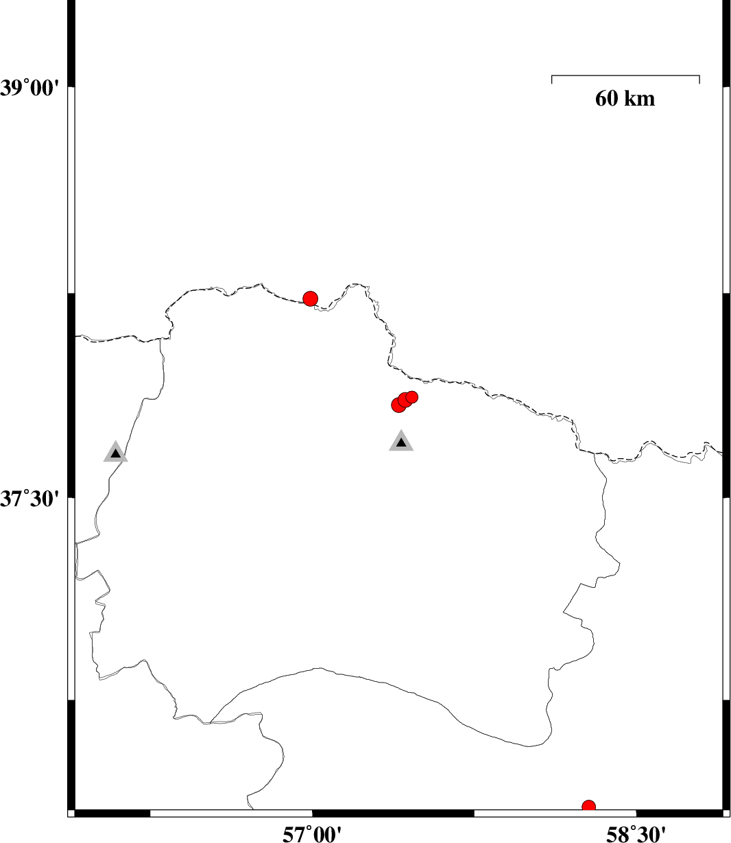 | 2012/12/23 | 21:24:16.1 | 00:54:16.1 | 37.87 | 57.46 | 6 | ML:2.6 | Khorasan(north) Province, 45 km North-East of Bojnurd | ||