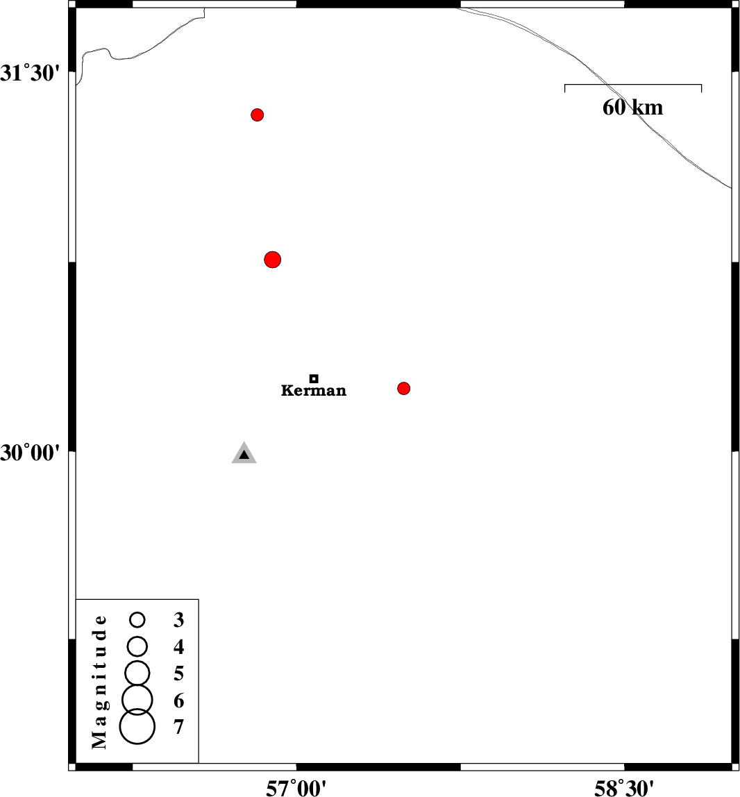 | 2012/12/19 | 11:44:17.7 | 15:14:17.7 | 30.76 | 56.89 | 18 | ML:3.4 | Kerman Province, 31 km East of Zarand | ||