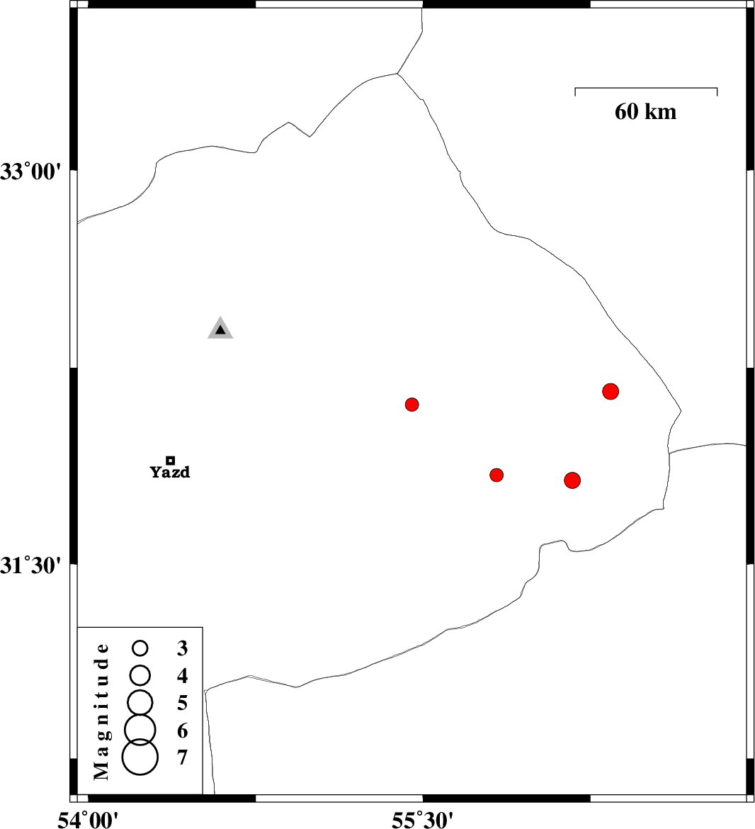 | 2012/12/29 | 11:24:22.0 | 14:54:22.0 | 31.82 | 56.17 | 14 | ML:3.2 | Yazd Province, 77 km North-East of Bafq | ||