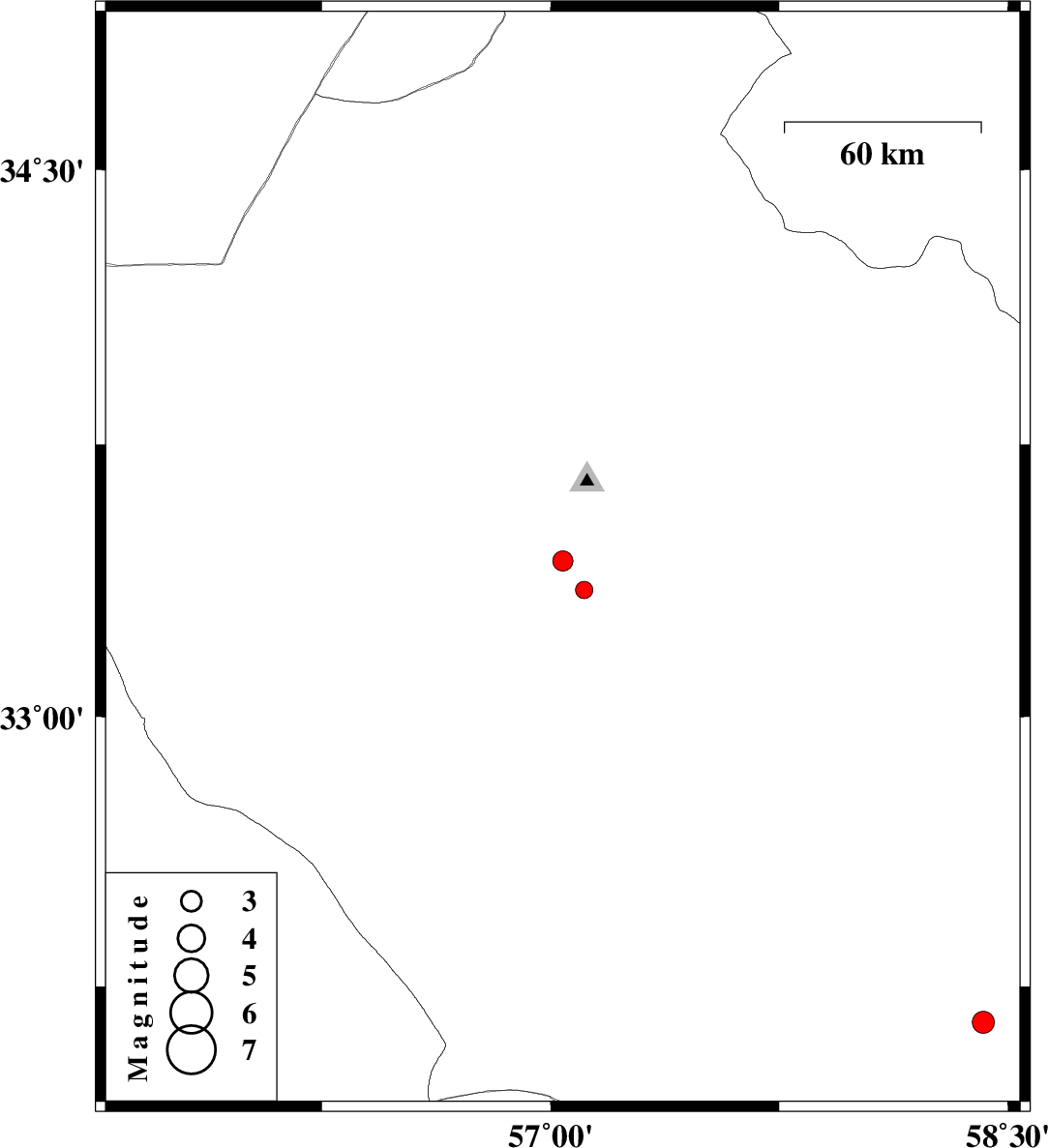 | 2013/01/07 | 12:42:56.1 | 16:12:56.1 | 33.43 | 57.04 | 14 | ML:2.9 | Yazd Province, 22 km South-East of Tabas | ||