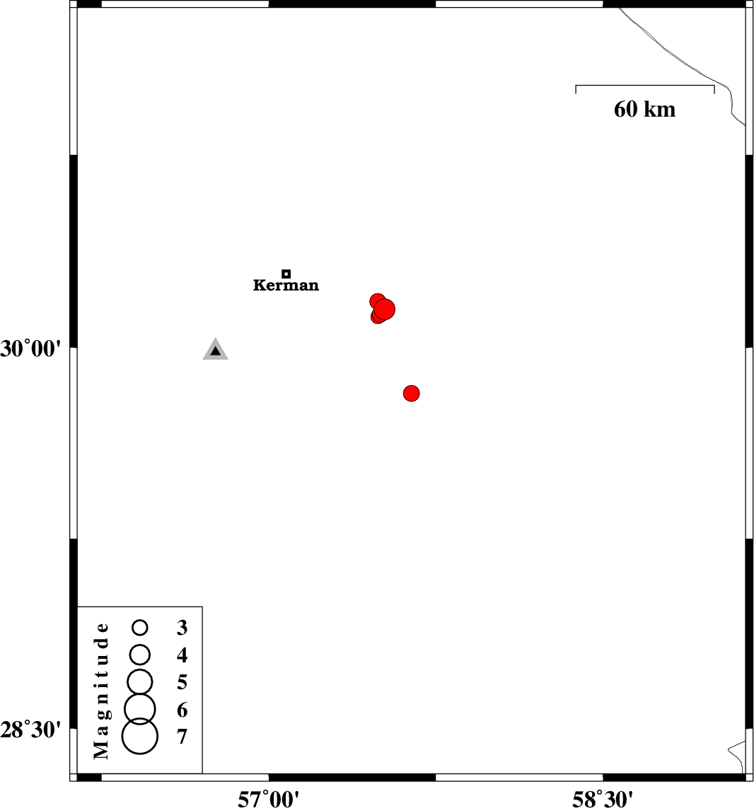| 2013/01/02 | 15:54:43.1 | 19:24:43.1 | 30.13 | 57.5 | 14 | ML:3.3 | Kerman Province, 44 km South-East of Kerman | ||