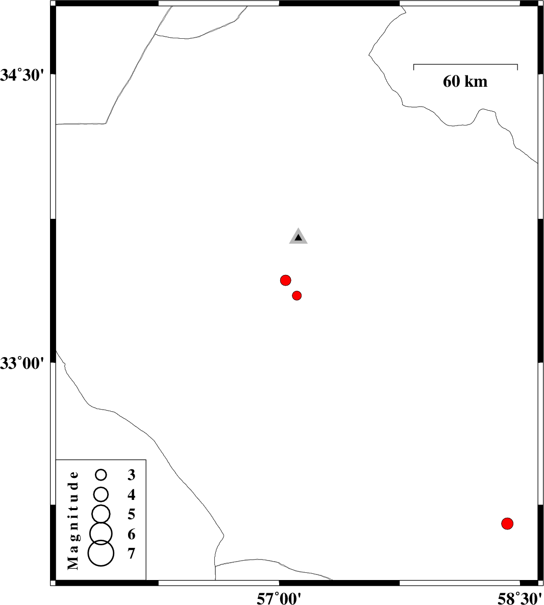| 2013/01/07 | 12:42:56.1 | 16:12:56.1 | 33.43 | 57.04 | 14 | ML:2.9 | Yazd Province, 22 km South-East of Tabas | ||