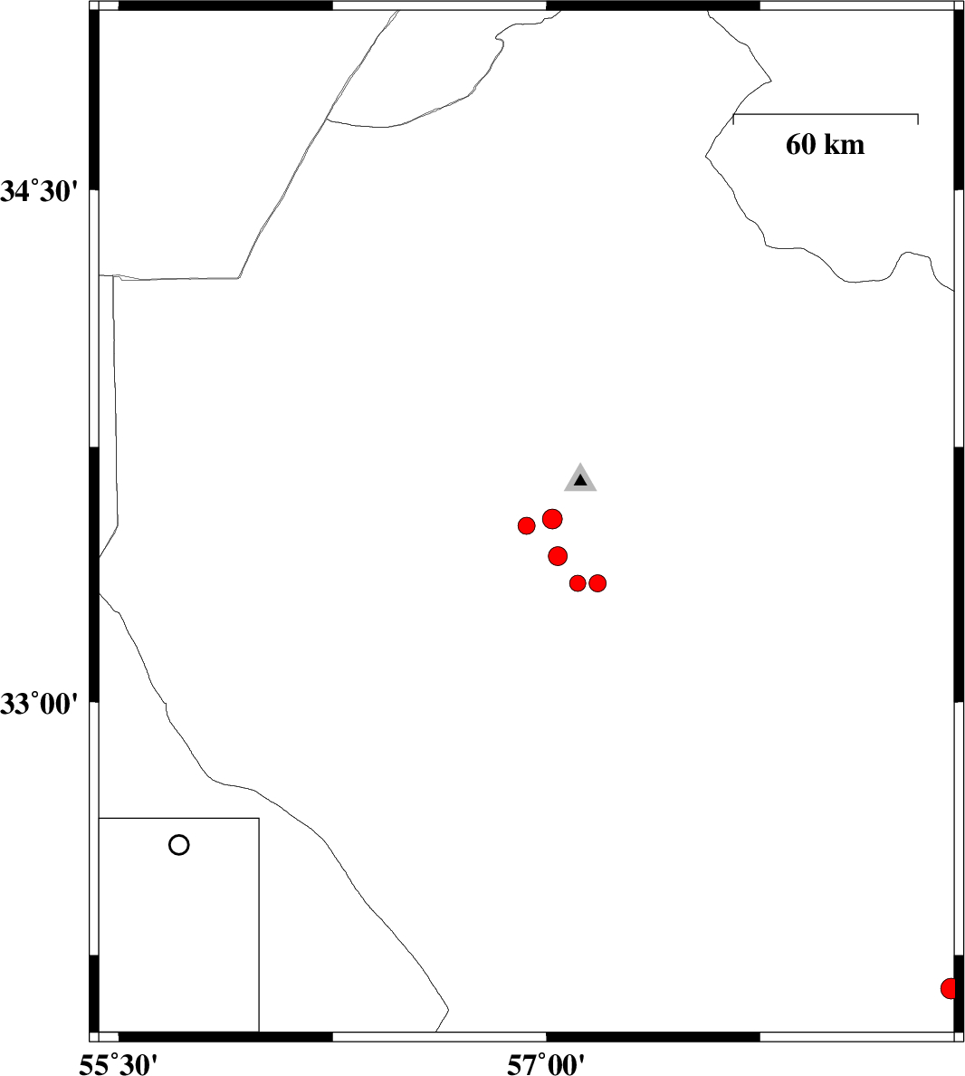 | 2013/01/07 | 12:42:56.1 | 16:12:56.1 | 33.43 | 57.04 | 14 | ML:2.9 | Yazd Province, 22 km South-East of Tabas | ||