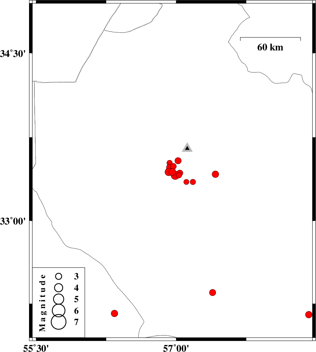2013/01/09 11:05:19.6 14:35:19.6 33.4656.9314 ML:3.1 Yazd Province, 15 km South of Tabas