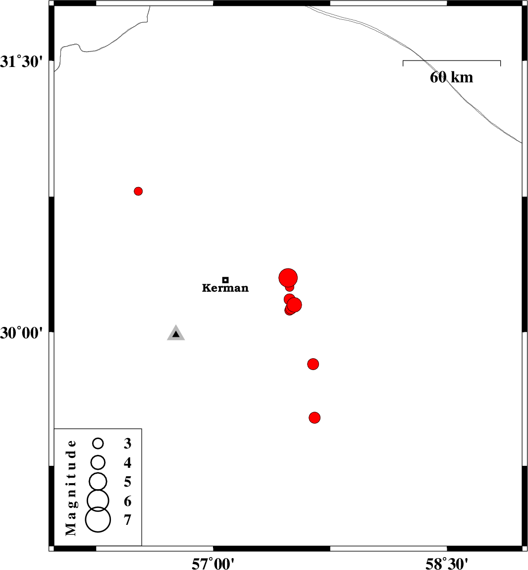 | 2013/01/02 | 15:54:43.1 | 19:24:43.1 | 30.13 | 57.5 | 14 | ML:3.3 | Kerman Province, 44 km South-East of Kerman | ||