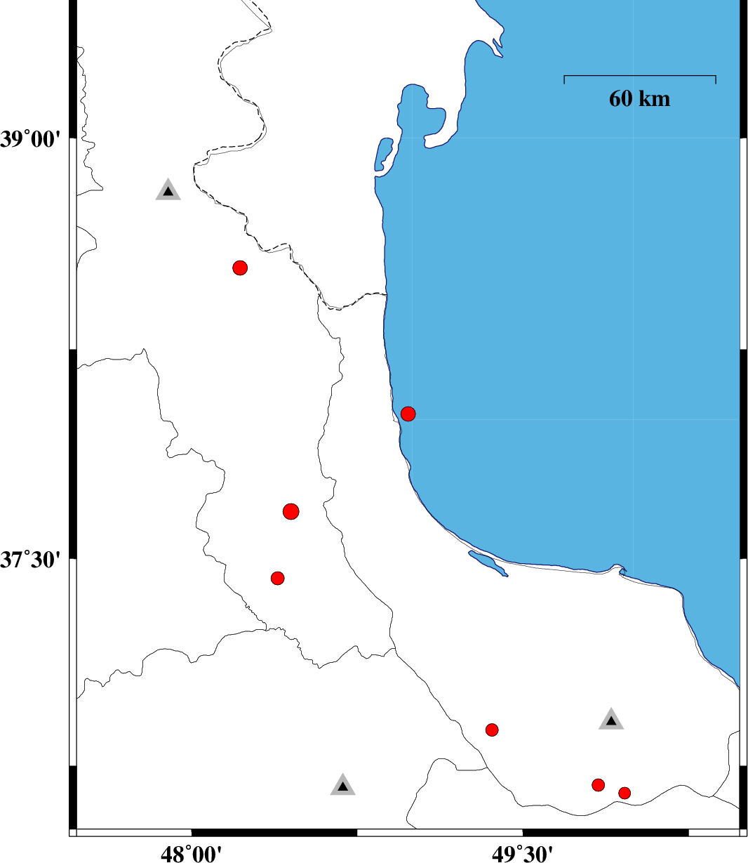 | 2013/01/03 | 02:26:41.6 | 05:56:41.6 | 37.43 | 48.39 | 14 | ML:2.7 | Ardebil Province, 30 km South of Givi | ||