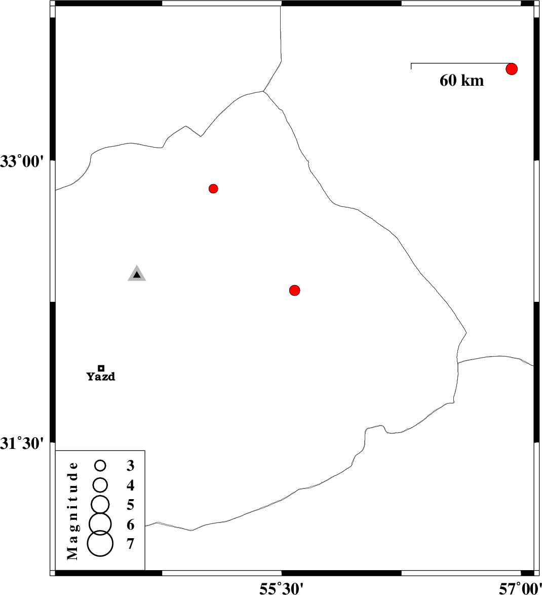 | 2013/01/18 | 18:26:20.3 | 21:56:20.3 | 33.48 | 56.94 | 6 | ML:3.2 | Yazd Province, 13 km South of Tabas |