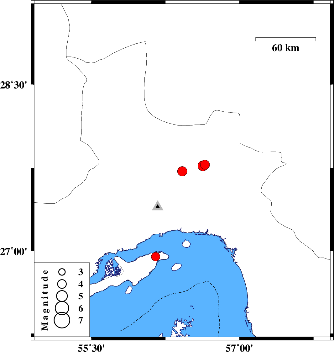 | 2013/01/07 | 00:41:58.1 | 04:11:58.1 | 26.95 | 56.15 | 14 | ML:4 | Persian Gulf, 11 km West of Qeshm |