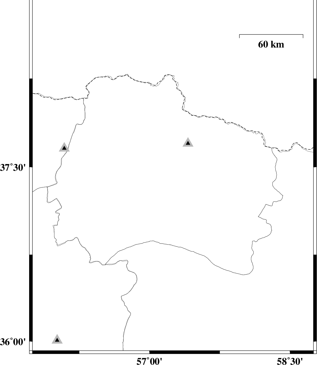 | 2013/02/12 | 12:26:58.1 | 15:56:58.1 | 37.31 | 57.18 | 25 | ML:3.9 | Khorasan(north) Province, 23 km South-West of Bojnurd | ||