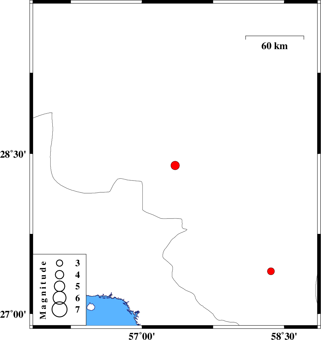 | 2013/02/16 | 13:09:05.1 | 16:39:05.1 | 28.39 | 57.35 | 14 | ML:4.1 | Kerman Province, 49 km South-West of Jiroft | ||