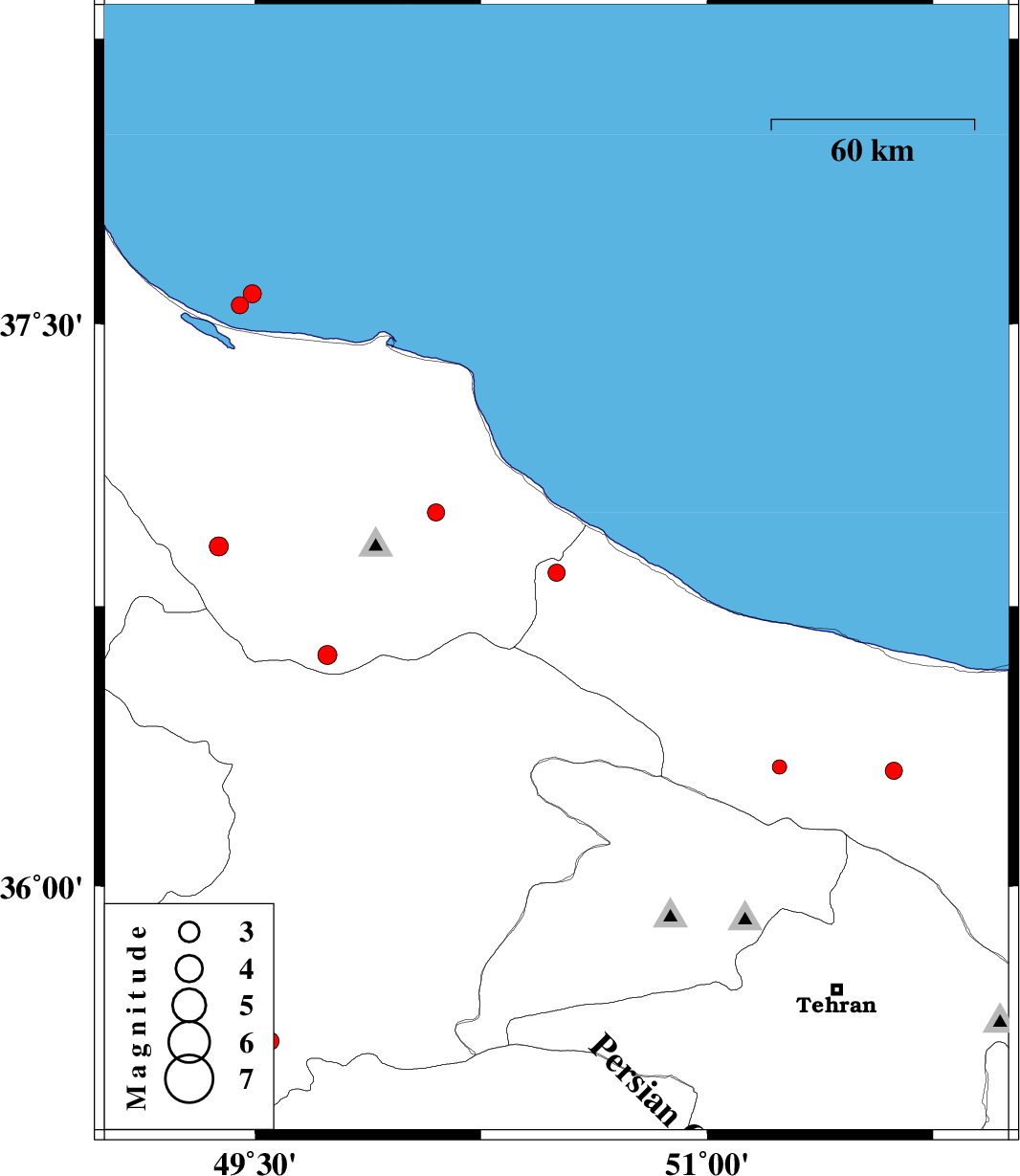 | 2013/01/29 | 10:51:41.7 | 14:21:41.7 | 37.58 | 49.49 | 14 | ML:2.7 | Caspian Sea, 12 km North of Bandar-e anzali | ||