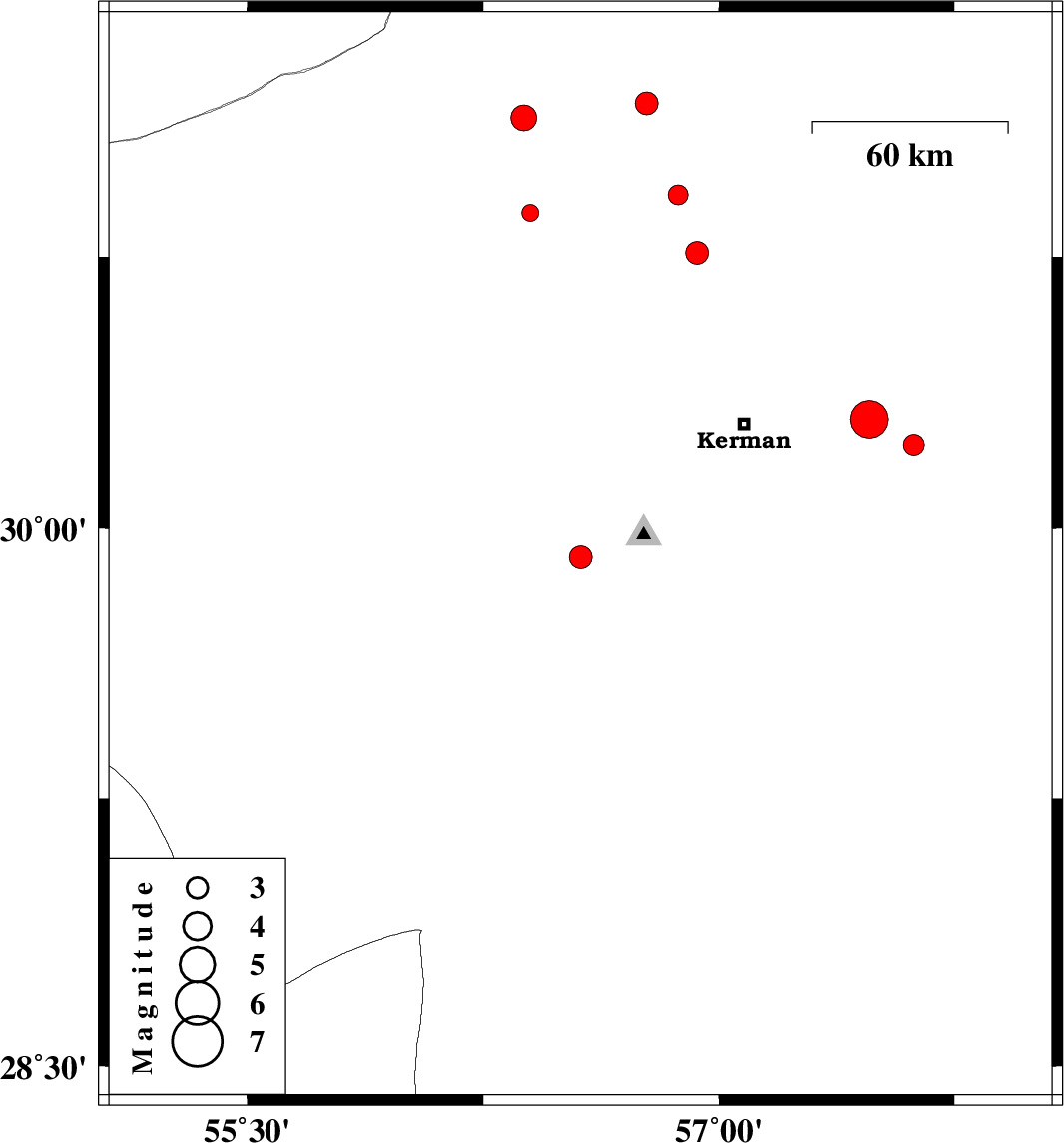 | 2013/02/10 | 01:56:27.8 | 05:26:27.8 | 30.23 | 57.62 | 18 | ML:2.9 | Kerman Province, 52 km East of Kerman | ||