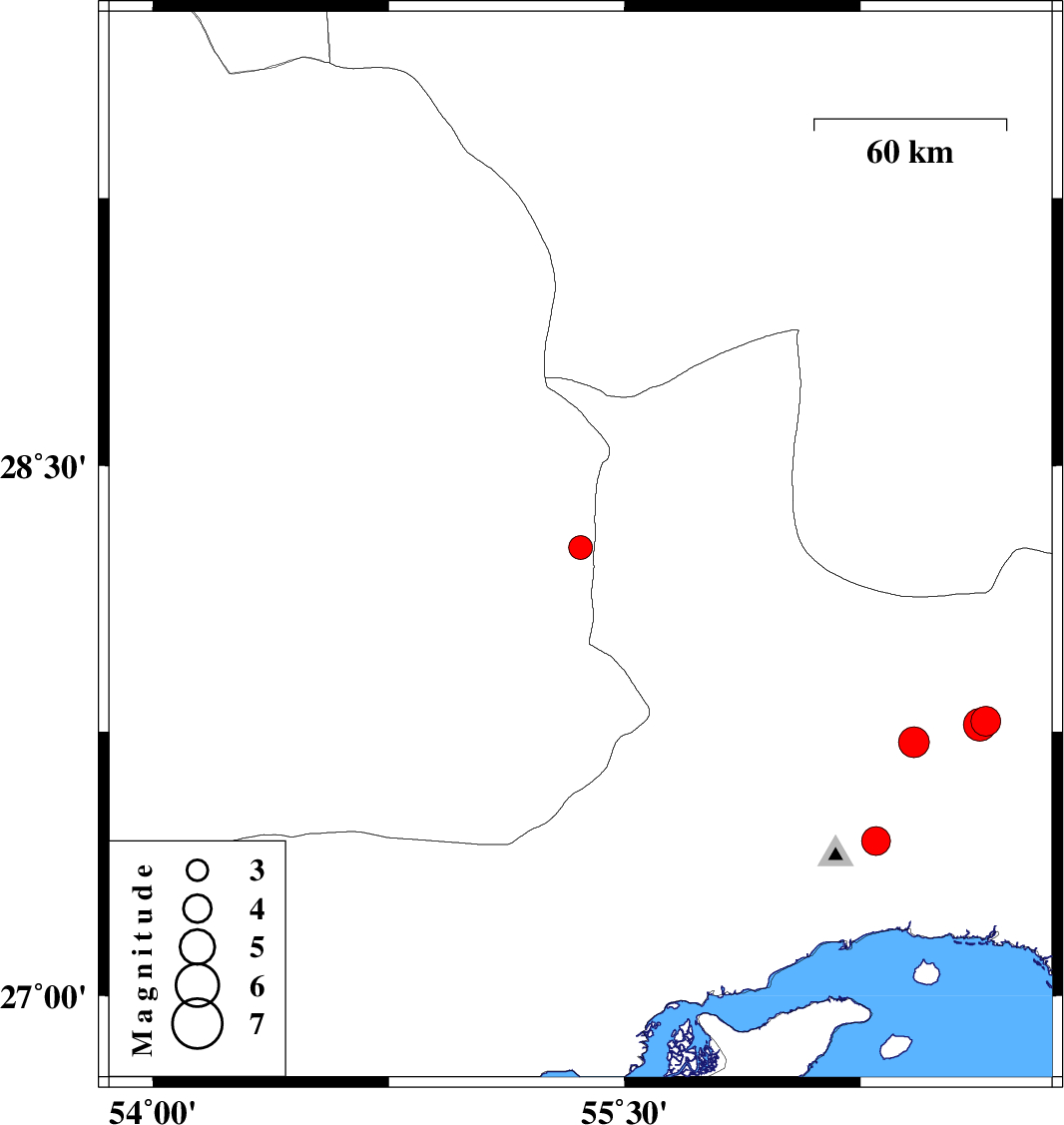 | 2013/02/07 | 13:42:09.1 | 17:12:09.1 | 27.44 | 56.3 | 15 | ML:4.1 | Hormozgan Province, 29 km North of Bandar-e abbas | ||