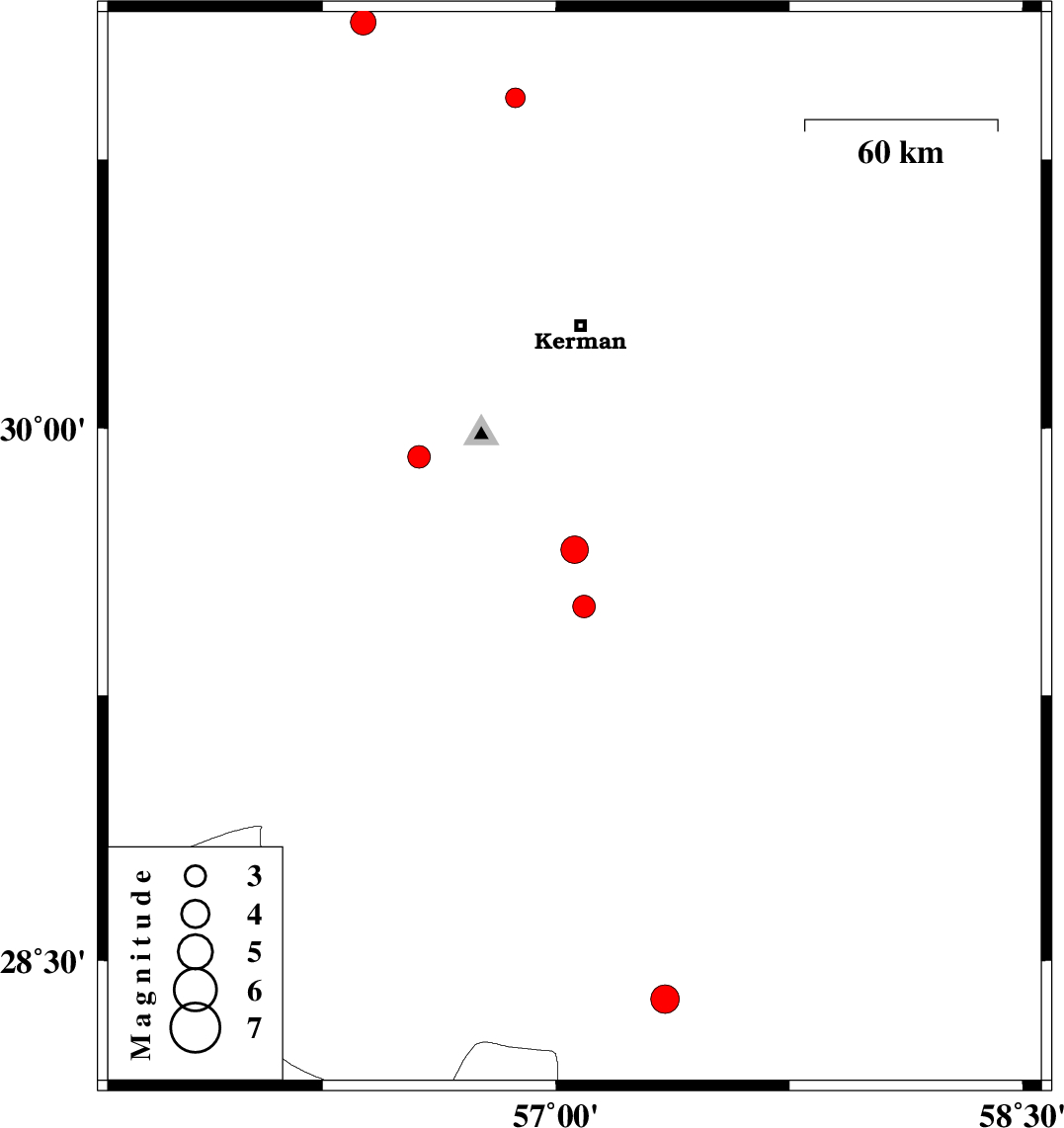| 2013/02/16 | 13:09:05.1 | 16:39:05.1 | 28.39 | 57.35 | 14 | ML:4.1 | Kerman Province, 49 km South-West of Jiroft |